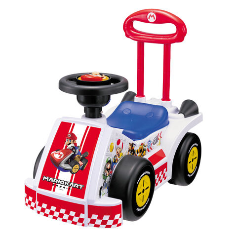 本商品は、Nintendo Switch用レース「マリオカート8DX」をモチーフにした乗用玩具。本体には「マリオカート」のデザインがプリントされており、ハンドルに付いているマリオボタンを押すことでコーススインファンファーレやエンジン音、「レッツ ア ゴー!」などマリオのボイス、アイテムボックス音やスーパースター音、マリオカートスタジアムのテーマ曲など、「マリオカート」のゲームサウンド20種類を楽しめる。